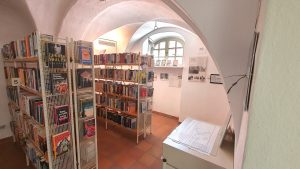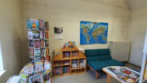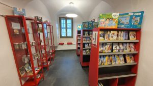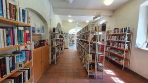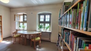 Nachschlagewerke sowie einen kleinen historischen Regionalbestand bietet die Bibliothek zur Nutzung im Lesesaal an. Nach der Sommerpause 2025 bieten wir dann auch Gesellschafts- und Brettspiele an. Zudem arbeiten wir gerade daran thematische Bücherpakete für die Kindergärten und Schulen zusammenzustellen, die dann auch verliehen werden können.