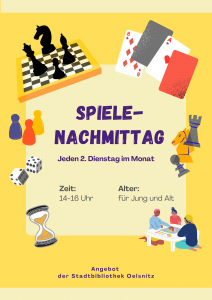 - Spielenachmittag mit Gesellschafts-& Brettspielen (jeden 2. Dienstag im Monat,14-16 Uhr)